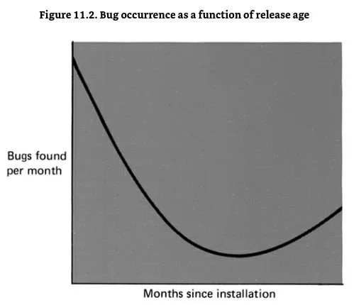 ソフトウェアの寿命におけるバグの月間発生数。リリース後一旦落ち着くが、古くなると次第に維持コストが上がる